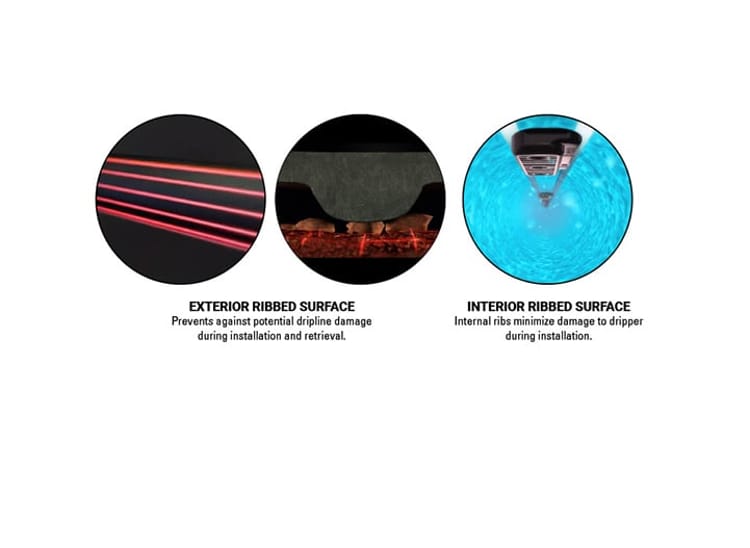 The new extra tough drip line with unique ribbed surface acts as a barrier between the ground and the pipe making installation and retrieval smoother than ever before.