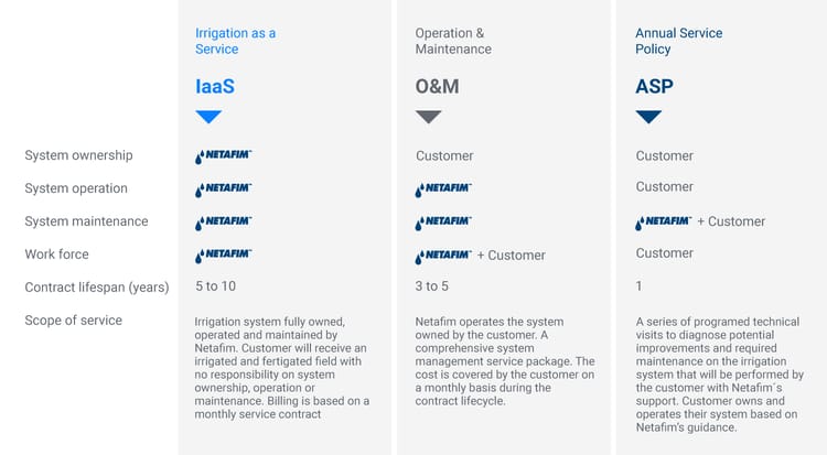 For a fixed contract fee you receive a perfectly irrigated and fertigated crop without the responsibility of ownership, operation or maintenance. Instead the irrigation system is owned, operated and maintained by Netafim.