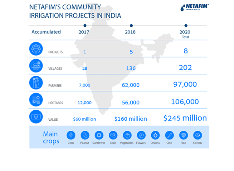 On August 10, 2020, Netafim announced that following its successful community irrigation projects in India, it has secured another mega deal estimated at approx. 85 million (US) dollars for providing advanced irrigation systems to 35 thousand farmers.